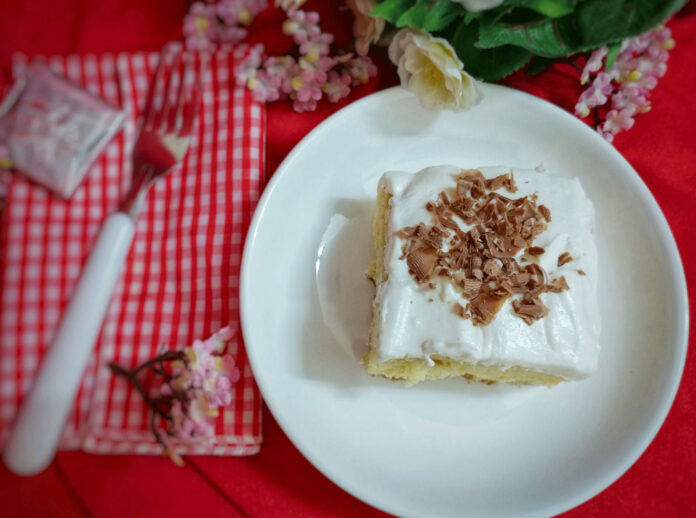 সবকিছু মিশানো হয়ে গেলে চারকোনা বেকিং প্যানে তেল ব্রাশ করে উপরে পার্চমেন্ট পেপার বিছিয়ে কেকের মিশ্রণ ঢেলে দিন। ১৮০ ডিগ্রি সেলসিয়াসে ৩০-৩৫ মিনিট বা ৪০ মিনিটও লাগতে পারে বেক করুন। কেক ৩০ মিনিট পর একটা টুথপিক ঢুকিয়ে বের করুন। যদি টুথপিক পরিষ্কার হয়ে আসে তাহলে বুঝতে হবে কেক তৈরি হয়ে গেছে। না হলে আরও কয়েক মিনিট বেক করে নামিয়ে নিন। এবার কেকের নিচের পেপার তুলে নিয়ে কেকটা প্যানে আবার বসিয়ে দিয়ে কাঁটা চামচ দিয়ে কেকের উপরে ফুটা করে দিন । অন্যদিকে বাটিতে তরল মিল্ক, এভাপোরেটেড মিল্ক আর কনডেন্সড মিল্ক মিশিয়ে কেকের উপর ছড়িয়ে দিন দেখবেন কেক দুধের মিশ্রণটা শুষে নিয়েছে। এবার ইচ্ছে হলে উপরে হুইপড ক্রিম বিছিয়ে দিয়ে ফ্রিজে রেখে ১/২ ঘণ্টা ঠাণ্ডা করে কেটে পরিবেশন করুন মজার এই কেক।