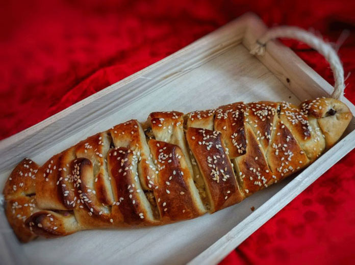 এরপর নিজের পছন্দ মতো স্টাফিং রুটির মাঝ বরাবর বিছিয়ে দিয়ে ছুরি দিয়ে দুই পাশ দাগ কেটে নিন। দুই পাশের দাগ কাটা রুটির অংশ একটার উপর একটা দিন অনেকটা বেনি করার মতো করে। এবার বেকিং ট্রেতে নিয়ে ডিম ব্রাশ করে উপরে ইচ্ছে হলে তিল বা কালোজিরা ছিটিয়ে দিয়ে ১৮০ ডিগ্রি সেলসিয়াসে ১৫-২০ মিনিট বেক করুন। ১০ মিনিট হলে চেক করা শুরু করবেন অনেক সময় তারাতাড়ি হয়ে যায়। হয়ে গেলে হালকা ঠাণ্ডা হলে কেটে পরিবেশন করুন।