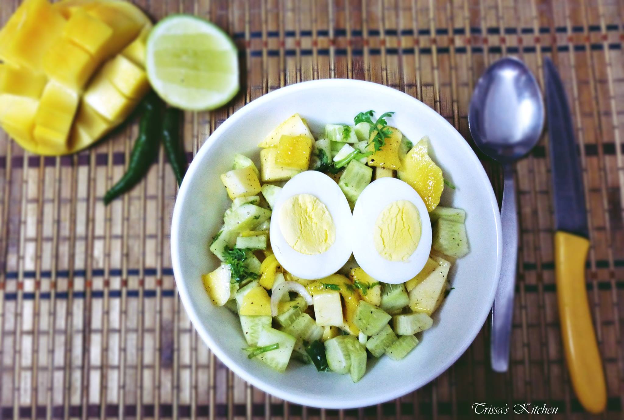 তৈরি করার নিয়মঃ প্রথমে আম ভালো ভাবে ধুয়ে খোসা ছাড়িয়ে কিউব করে কেটে নিন। একই ভাবে শসা আর পেঁয়াজ কেটে নিন। এবার একটি পাত্রে বাকি সব উপকরণ দিয়ে আম, পেঁয়াজ আর শসা হাল্কা হাতে মিশিয়ে নিন। ফ্রিজে রেখে দিন ১/২ ঘণ্টা। ঠাণ্ডা ঠাণ্ডা পরিবেশন করুন।
